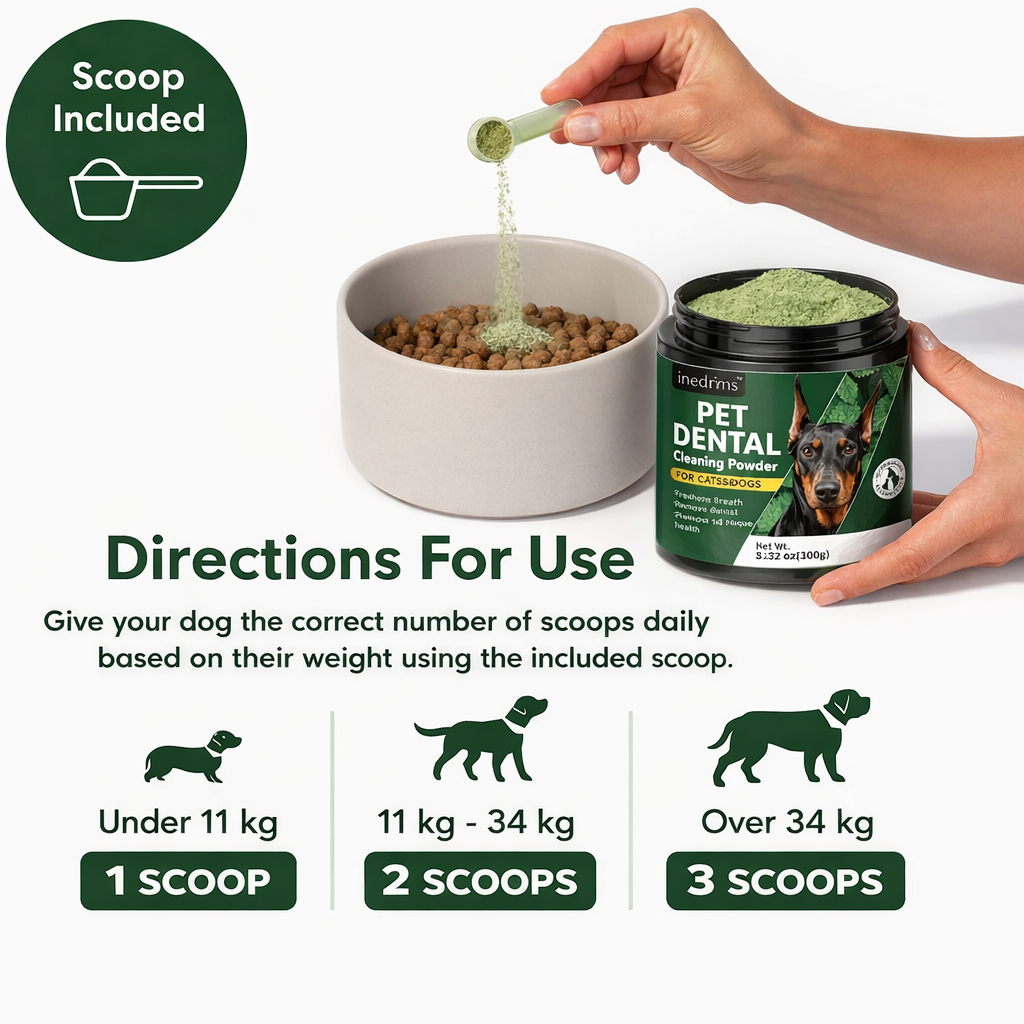 For the best dental health, use dental powder once a day. Simply mix it into your pup's meal as part of their daily routine. Regular use helps reduce bad breath and supports overall oral hygiene.